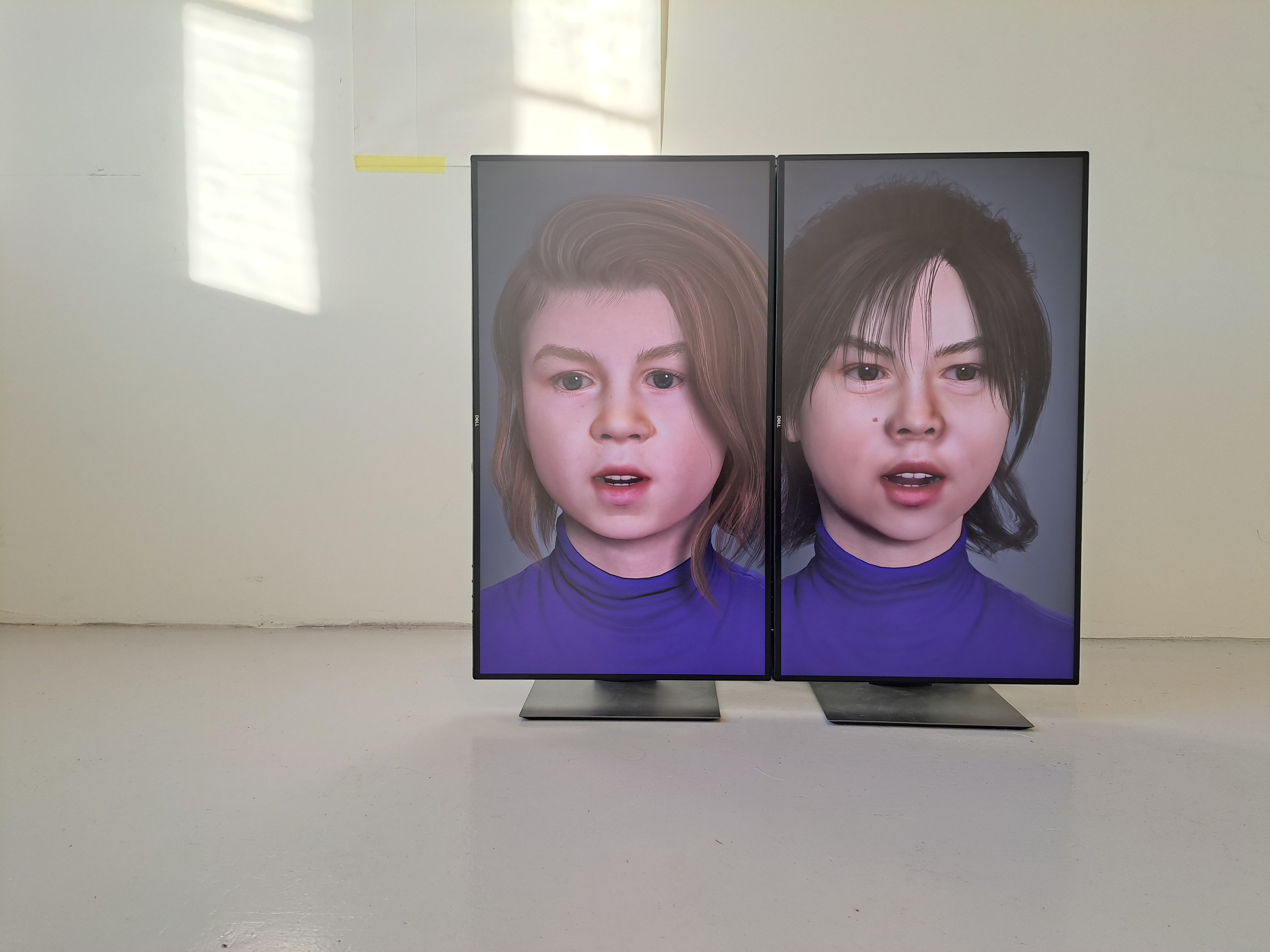 The generative video work 'H-E' from 2023 explores the nature and timbre of the boy's voice, and shows two animated boy singers, each on their own screen, each with their own voice. The work was presented at the CPH:DOX festival at Litteraturhaus in Copenhagen in March 2023, performing the piece 'Sange fra i dag’ by Anders Lauge Meldgaard and Aske Zidore, accompanied live by piano and flute.